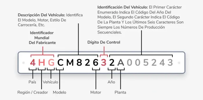 - VIS (Vehicle Identifier Section): serial único, año/modelo, planta.